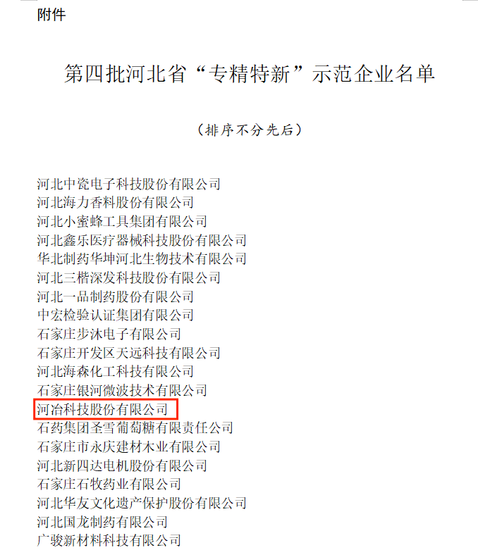 2021年12月30日,河北省工業(yè)和信息化廳發(fā)布了《關(guān)于公布第四批河北省“專精特新”示范企業(yè)的通知》(冀工信企業(yè)函〔2021〕1029號(hào))。通過(guò)前期申報(bào),河冶科技股份有限公司通過(guò)了市級(jí)、省級(jí)的嚴(yán)格審核,被認(rèn)定為河北省“專精特新”示范企業(yè)。